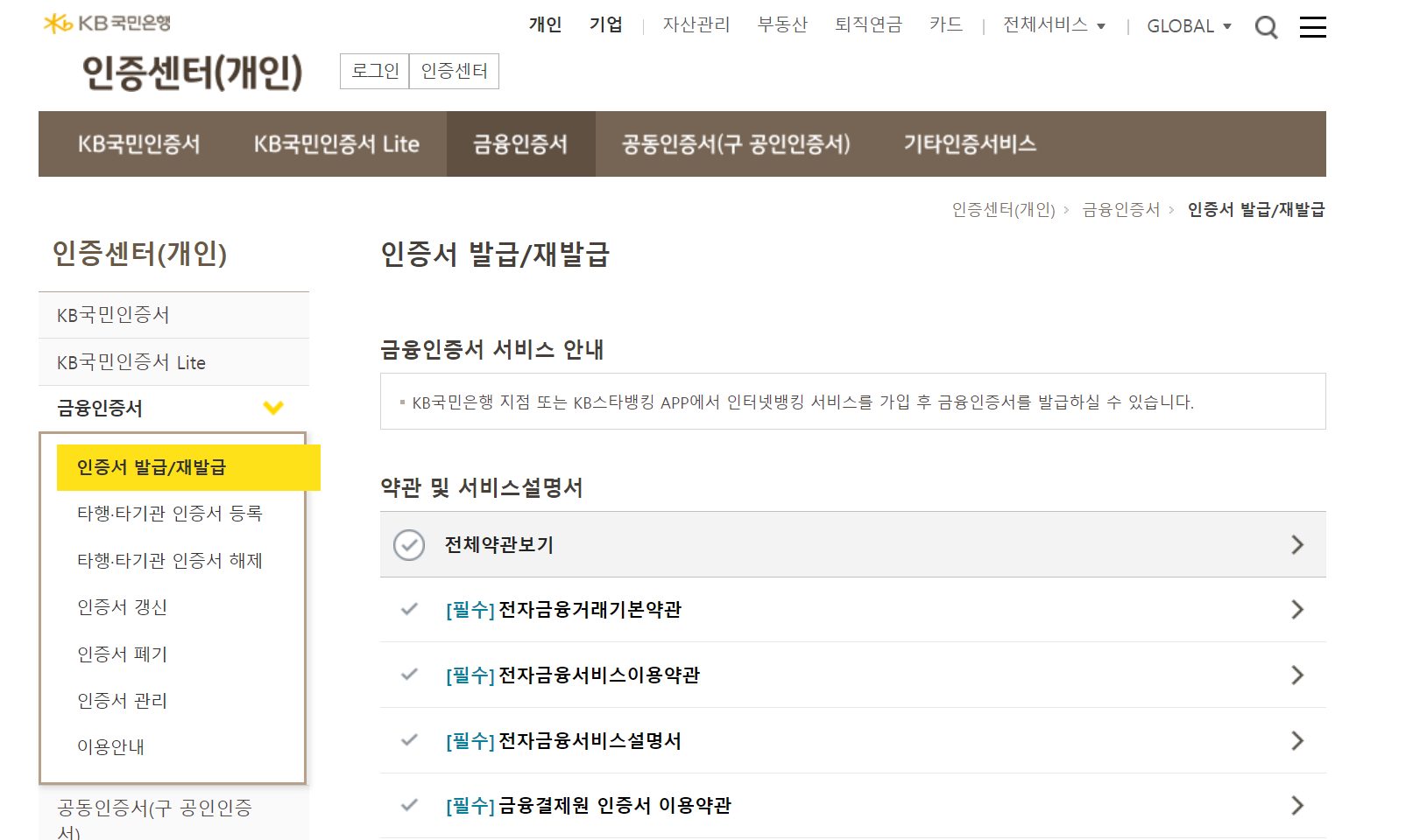 4. 공인인증서 페이지에서 인증서 발급/재발급 선택