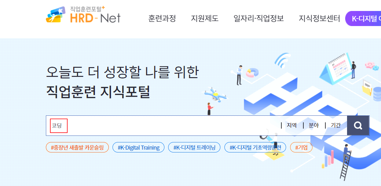 직업훈련포털 메인페이지 검색창에 코딩을 쳐봤습니다. 저는 요즘 코딩에 관심이 많아져서 혹시 배울 수 있는 곳이 있나 검색해 보았는데, 지역도 선택이 가능합니다. 배우고 싶은 과목도 좋지만 앞으로 미래에 유망한 직업은 무엇이 있는지 알아보고 관련분야도 미리 공부해 놓는다고 생각하고 배우시는 것도 좋을 것 같습니다.