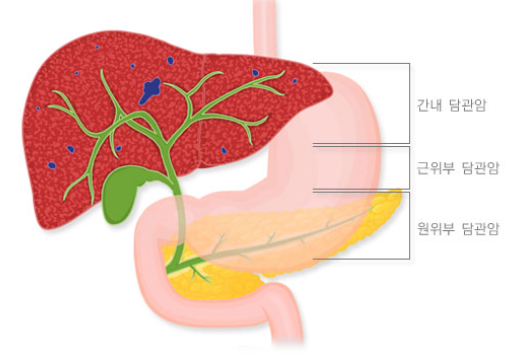 담도암이 무엇인지 위에서 간단하게 설명을 해드렸는데요. 담도암은 위치에 따라서 간내 담도암이랑 간외 담도암으로 나뉩니다. 세포 형태에는 차이가 없으며 간내 담도암은 간암에 포함됩니다.
