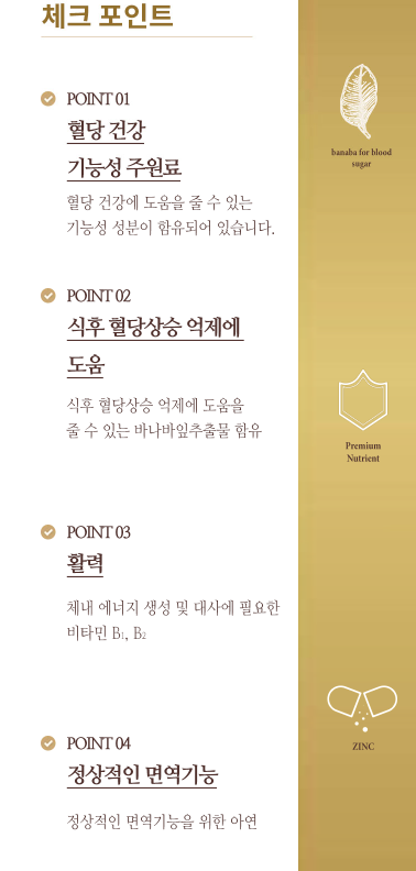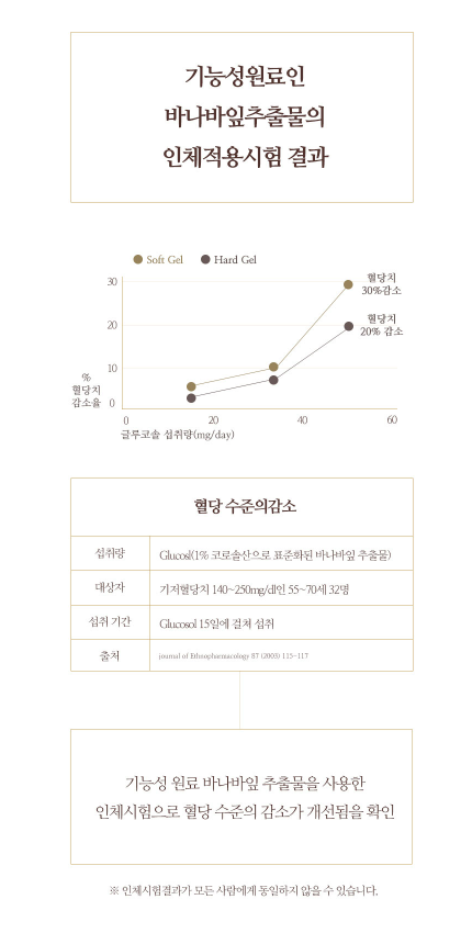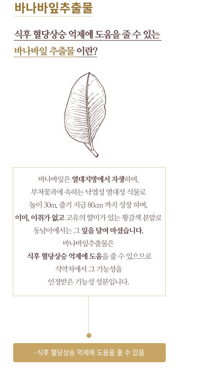 가장 큰 포인트는 바로 혈당 수치 상승을 억제한다는 점입니다. 이 제품에 들어있는 바나나잎 추출물은 열대 지방에서 재배되며, 동남아시아에서는 이 잎은 달여서 마시는 전통적인 관습이 있습니다. 이에 현대 과학적인 연구를 더해서 바나나잎 추출물을 만들었는데 이는 혈당 수치 상승을 감소시키는 역할을 하고 있습니다.