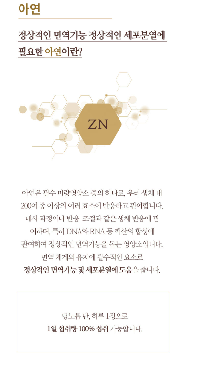 이 제품에 들어있는 아연은 대사 과정과 DNA 및 RNA의 합성에 필요한 미량 원소이고 비타민C와 여러 가지 버섯 추출물 그리고 야채혼합 농축 분말 등은 면역 기능을 유지하는데 도움이 됩니다.