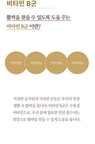 이 제품 안에 들어있는 원료 중 비타민 B군은 우리 삶의 에너지를 찾는데 도움을 주고 있습니다.