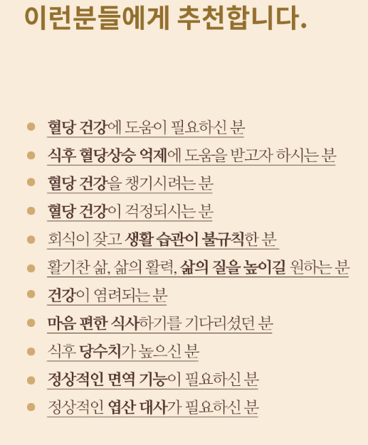 2. 식습관이 불규칙한 분: 이 제품을 꾸준히 섭취하면 식사 후 혈당 상승을 억제하는데 도움이 될 수 있습니다.