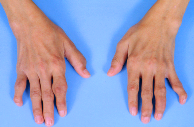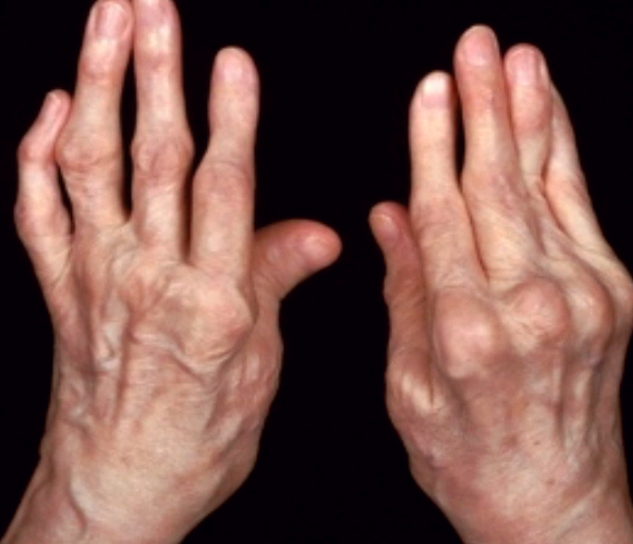 류마티스 관절염 초기증상으로 또한 손가락 모양에 변형이 오면서 관절이 서로 엇갈린 방향으로 무너져 전체적인 모양의 변형이 오는 경우랑, 손가락 끝부분 마디가 앞으로 구부러지면서 둘째 마디가 뒤로 180도 꺾이는 흔치 않은 특징을 보이기도 합니다.