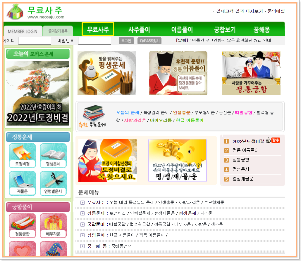 무료사주를 볼 수 있는 사이트인데요. http://www.neosaju.com/ 로 들어가시면 무료사주를 비롯해 사주풀이와 이름풀이, 궁합보기, 꿈해몽 등을 보실 수 있습니다. 무료사주는 말 그대로 무료로 사주를 볼 수 있고 궁합 보기와 꿈해몽도 무료로 이용 가능하십니다.
