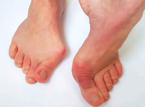 무지외반증 증상 대표적인 것은 엄지발가락 관절 안쪽의 돌출과 그 부위의 통증입니다. 관절 부분이 돌출이 된다면 신발을 신을 때마다 자극을 받아 염증이 생기면서 통증을 유발하게 됩니다.