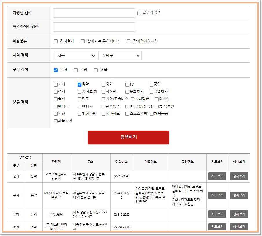 저는 서울 강남구에서 문화 - 음악 관련 가맹점을 검색해 보았습니다.