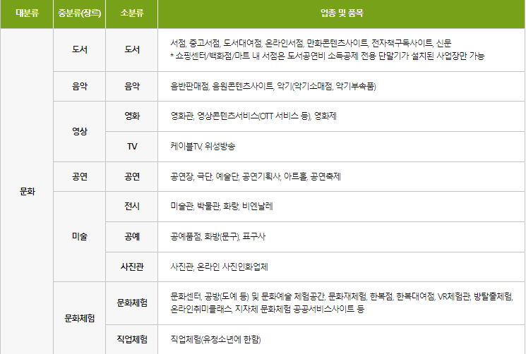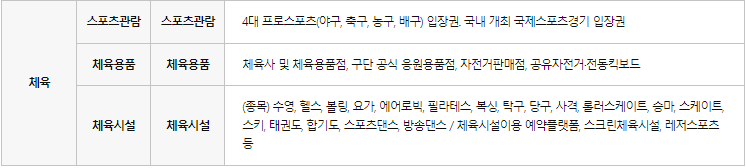 문화누리카드 가맹업종은 다음과 같습니다. 문화, 관광, 체육 카테고리 별로 어떠한 품목에서 사용할 수 있는지에 대한 내용이 대략적으로 명시가 되어 있습니다.