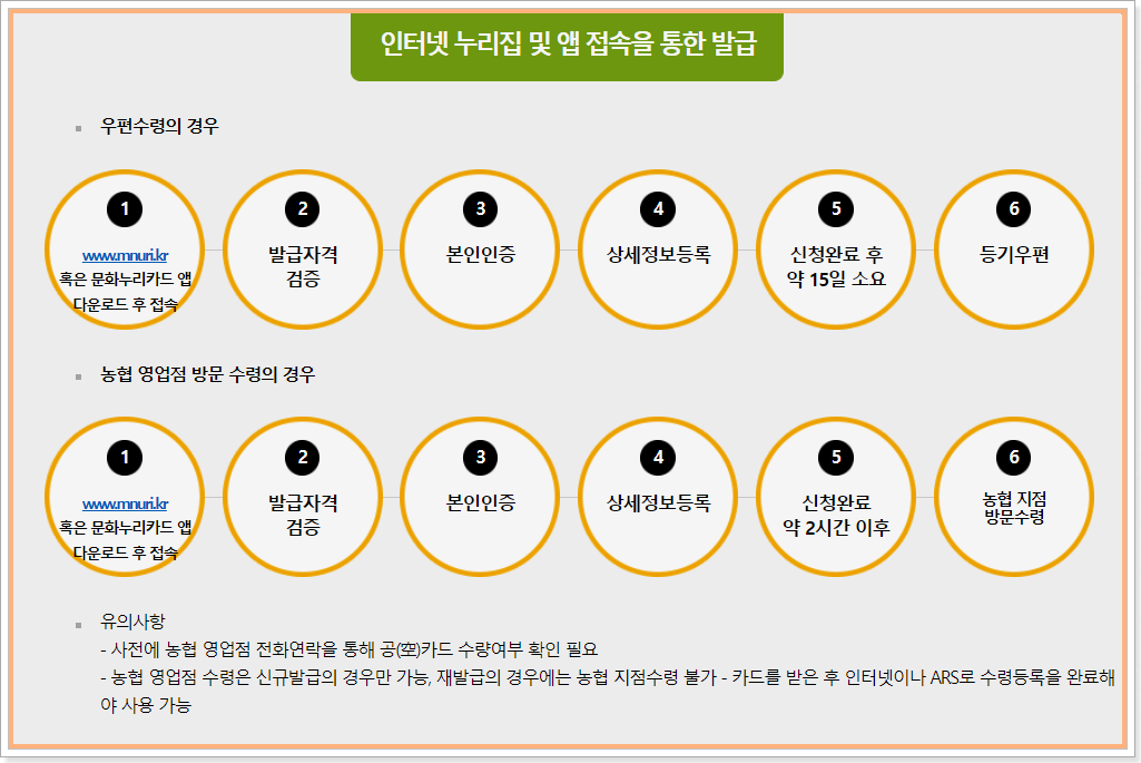 문화누리카드 신청방법은 다음과 같이 주민센터 방문을 통해 발급, 인터넷 누리집 또는 앱 접속을 통해 발급, 전화 ARS를 통한 재충전이 있습니다.