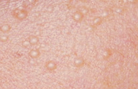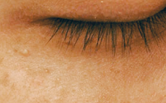 비립종이 자연적으로 발생하여 나타나는 것으로 대체로 뺨과 눈꺼풀 주위에 발생하고 있습니다.