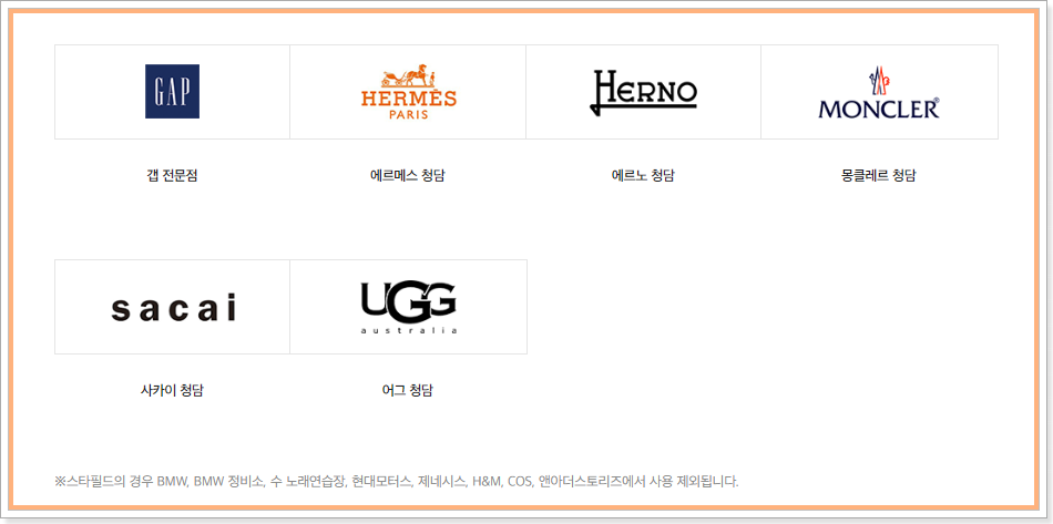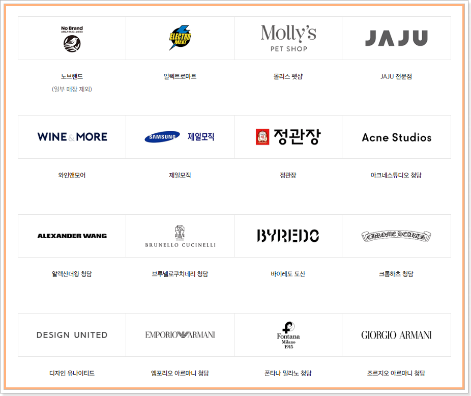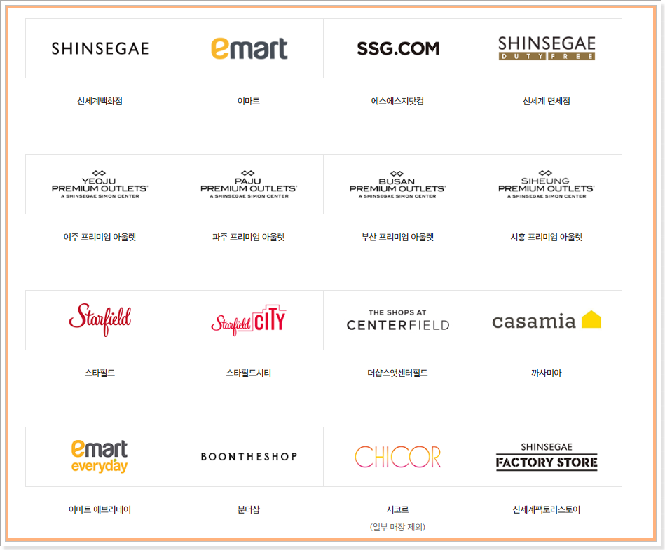 신세계백화점 상품권샵, 이마트 상품권샵, 이마트 24 (예약 후 수령), 조선호텔, 스타필드, 사이먼프리미엄아울렛