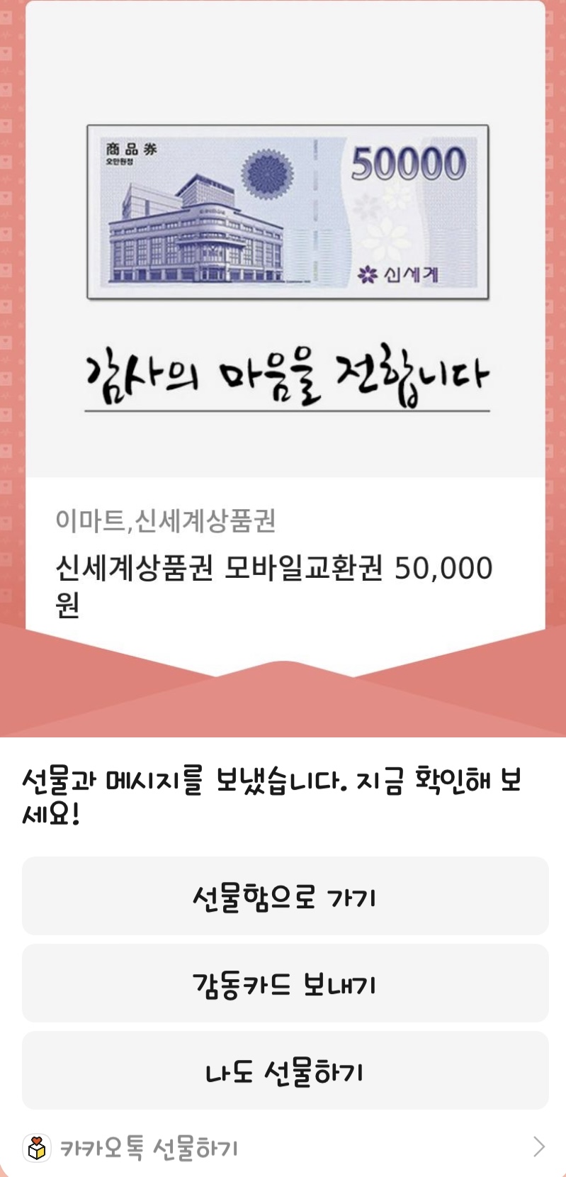 요즘 카카오톡으로 신세계 모바일 교환권 선물을 많이 주고받습니다. 받은 선물에서 선물함으로 가기로 가면 오른쪽과 같이 바코드가 나오는데요. 일반 모바일 교환권 같은 경우에는 바코드로 그 자리에서 결제가 가능한데, 신세계 모바일 상품권은 먼저 상품권을 오프라인(이마트)에서 교환받아서 사용을 하는 시스템입니다.
