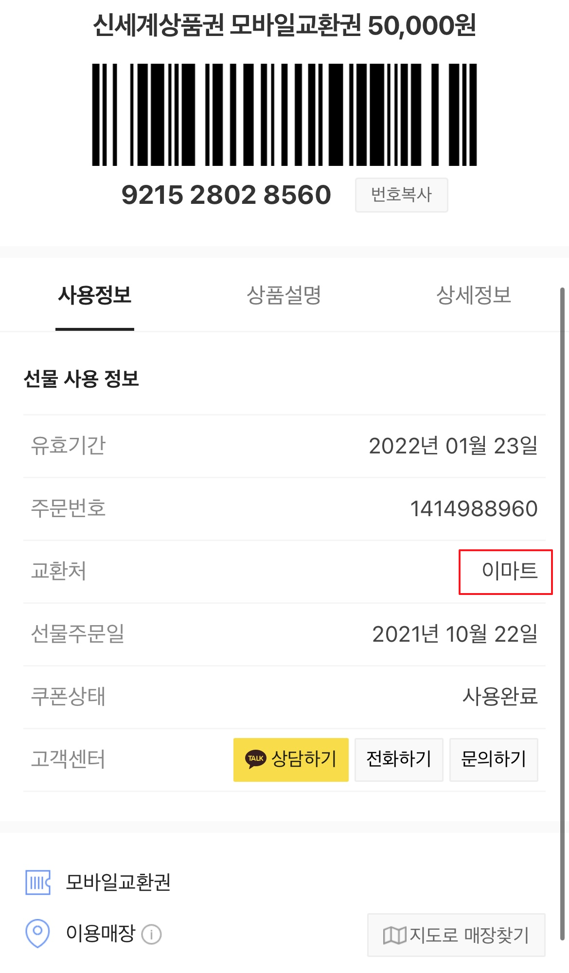 바로 교환처에 이마트라고 써있기 때문인데요. 교환권에 따라서 교환처가 이마트일 경우가 있고, 신세계 백화점일 경우가 있습니다. 그렇기 때문에 교환처를 먼저 확인하셔서 해당 교환처에 가셔서 무인 상품권 발급기에서 지류상품권을 발급받으실 수 있습니다.