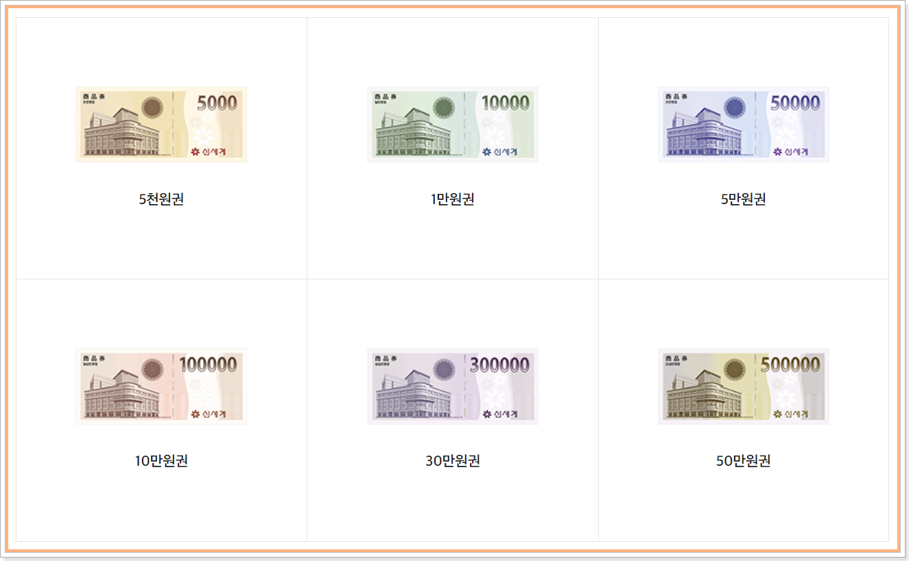 신세계상품권 종류는 우선 위와 같이 5천원권 / 1만원권/ 5만원권/ 10만원권/ 30만원권/ 50만원권 이렇게 총 6가지 종류가 있습니다.