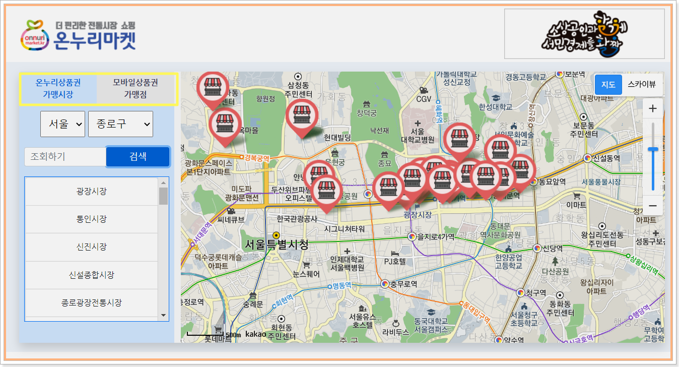 저는 예를 들어서 온누리상품권 가맹시장을 클릭하고 서울 종로구를 선택해보았습니다. 검색 결과 사용 가능한 시장이 위치와 함께 표시되고 있습니다.