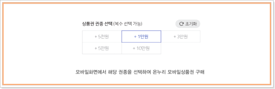 모바일상품권은 5천 원, 1만 원, 3만 원, 5만 원, 10만 원권까지 구입이 가능하고 복수 선택도 가능합니다.