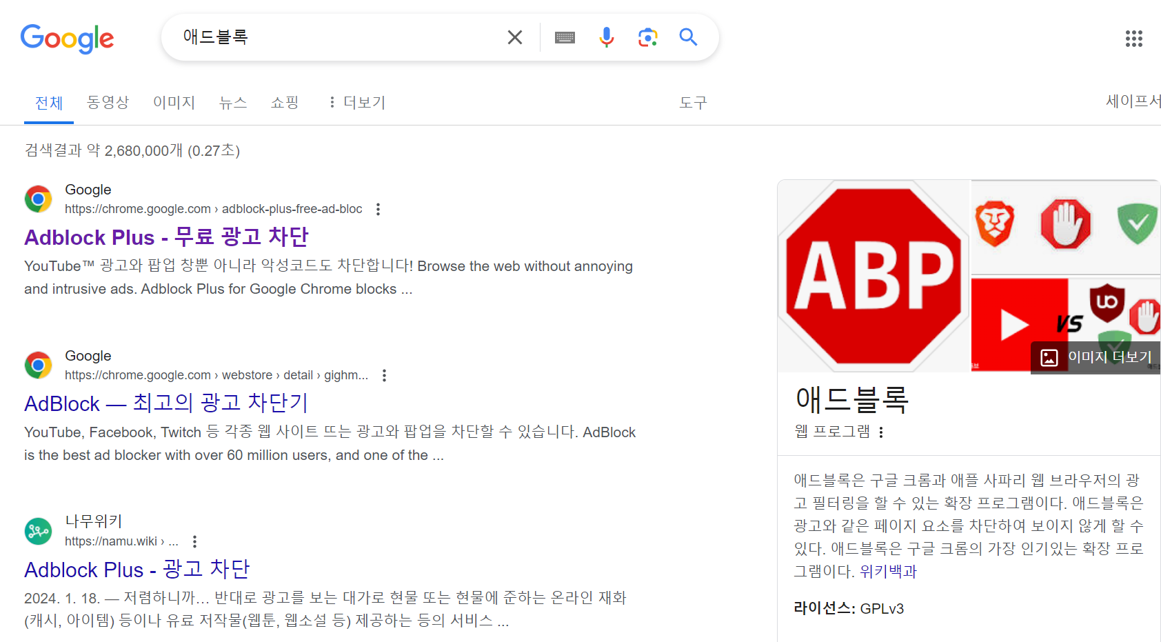 유튜브 프리미엄 결제 없이도 광고 없이 보는 방법이 있는데요. 구글에서 애드블록을 검색하시면 확장 프로그램을 다운로드하실 수 있습니다. 이것도 무료는 아니지만 본인이 결제 금액을 선택할 수 있어서 자유롭고, 마음에 안 들면 환불도 가능한 시스템이라고 하니 관심 있으신 분들은 시도해 보실 만할 것 같습니다.