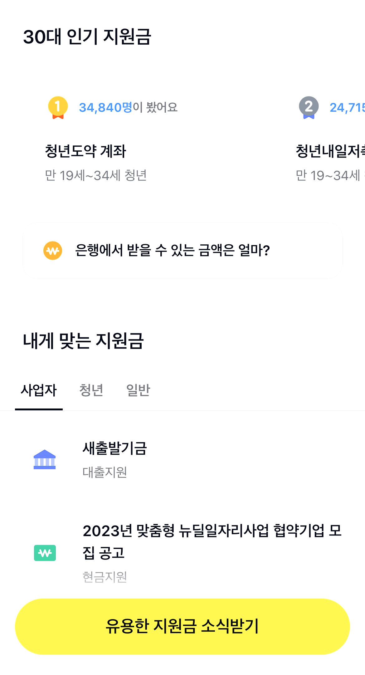 또한 각자의 상황에 따른 지원금도 확인할 수 있는데요. 사업자면 사업자, 청년 그리고 일반 이렇게 나뉘어 있어서 본인에게 해당하는 정부지원금이 있는지 좀 더 손쉽게 볼 수 있다는 장점이 있습니다.