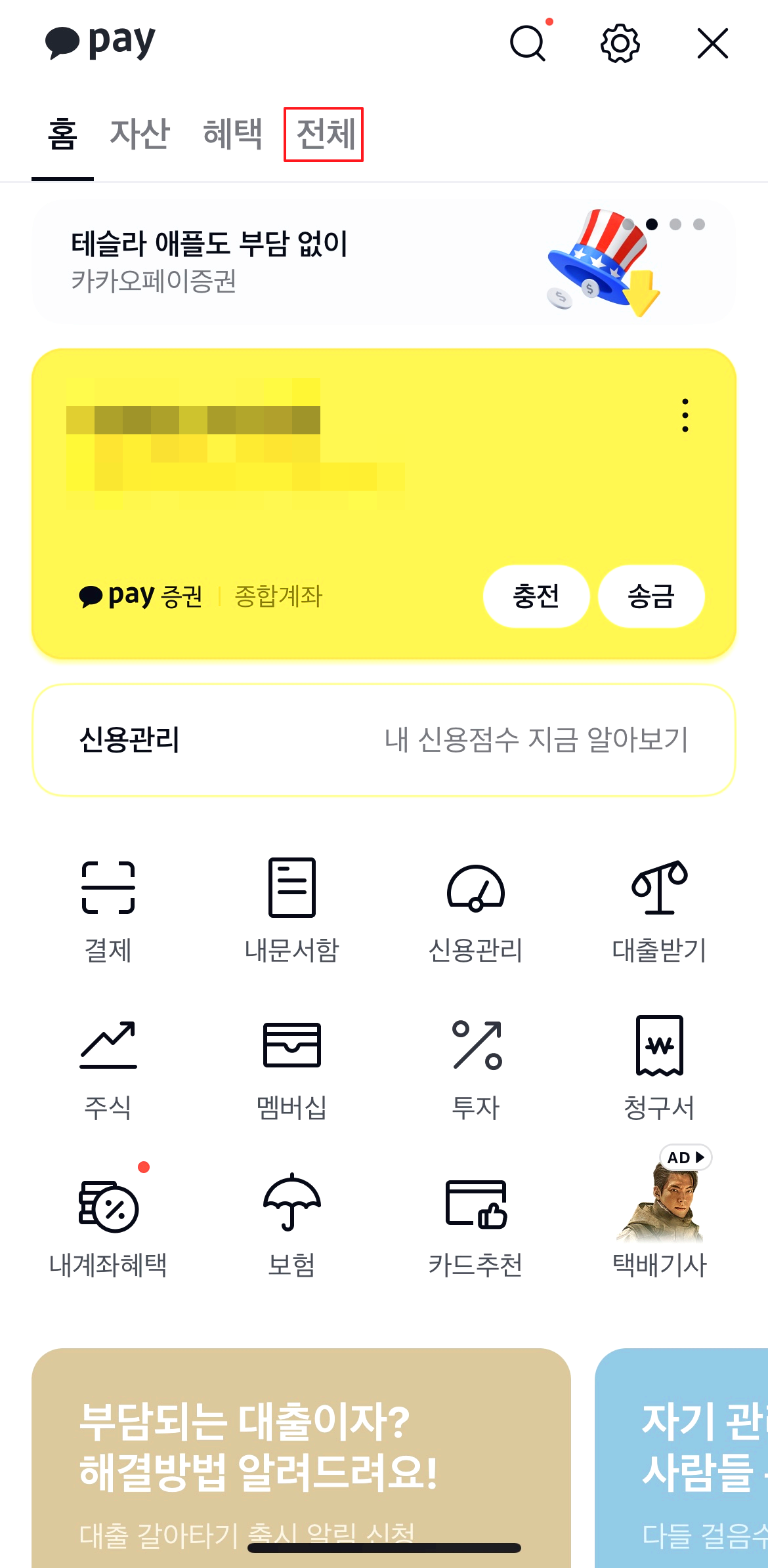 카카오톡에 들어가시면 오른쪽 하단에 점 3개짜리를 보실 수 있습니다. 이곳을 누르시면 카카오페이로 들어가게 되는데요. 카카오페이에서 전체를 클릭하시면 됩니다.