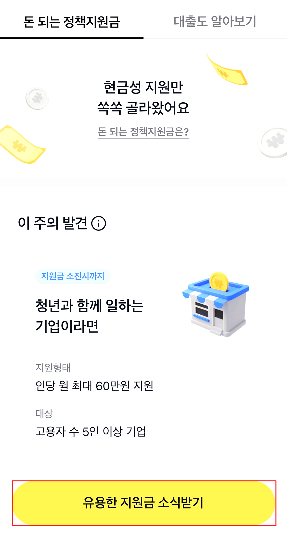 아래로 내려보면 가장 하단에 돈 되는 정책지원금이라는 것을 보실 수가 있습니다. 이곳에 들어가면 이 주의 발견이라고 해서 매주 소개하는 정부지원금을 한눈에 확인해 보실 수 있습니다. 매주 사업자와 청년 그리고 전 국민을 대상으로 새로운 공고가 업데이트됩니다. 그동안 발견하지 못했던 지원금이 있을 수도 있으니 매주 확인하시는 것이 좋겠죠.