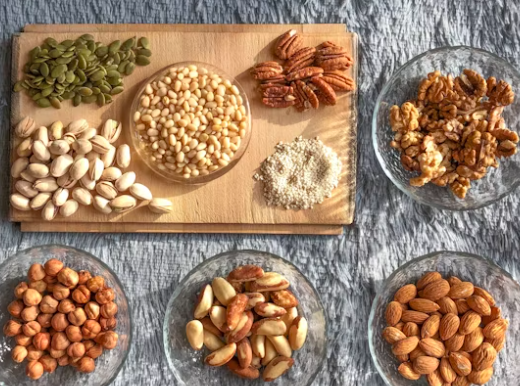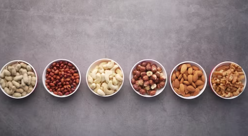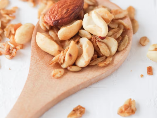 아몬드, 호두, 땅콩 등의 견과류는 단백질, 건강한 지방, 식이섬유를 제공하여 혈당을 안정화하고 포만감을 유지하는 데 도움을 줍니다.