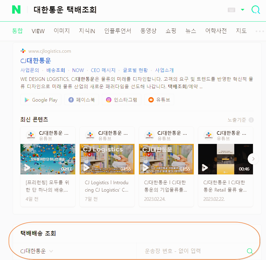 보통 잘 모르시는 분들이 가장 쉽게 접할 수 있는 방법은 바로 네이버 검색창을 통한 방법입니다. 아래와 같이 대한통운 택배조회라고 검색하시면 가장 위에는 CJ대한통운 홈페이지가 나오는데요. 홈페이지로 들어가지 마시고 아래의 택배배송 조회로 검색하시면 됩니다.