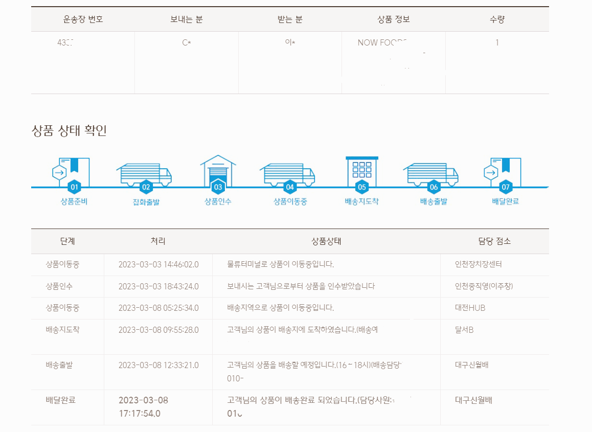 입력하면, 아래와 같이 보내는 분과 받는 분 그리고 상품 정보와 아래 상품 상태를 정확하게 확인할 수 있는 정보까지 나옵니다. 네이버에 바로 검색했을 때 보다 홈페이지에서 검색을 하면 택배기사님 성함과 전화번호까지 알 수 있고, 상품 이동 경로를 좀 더 자세하게 확인할 수 있다는 점이 장점입니다.