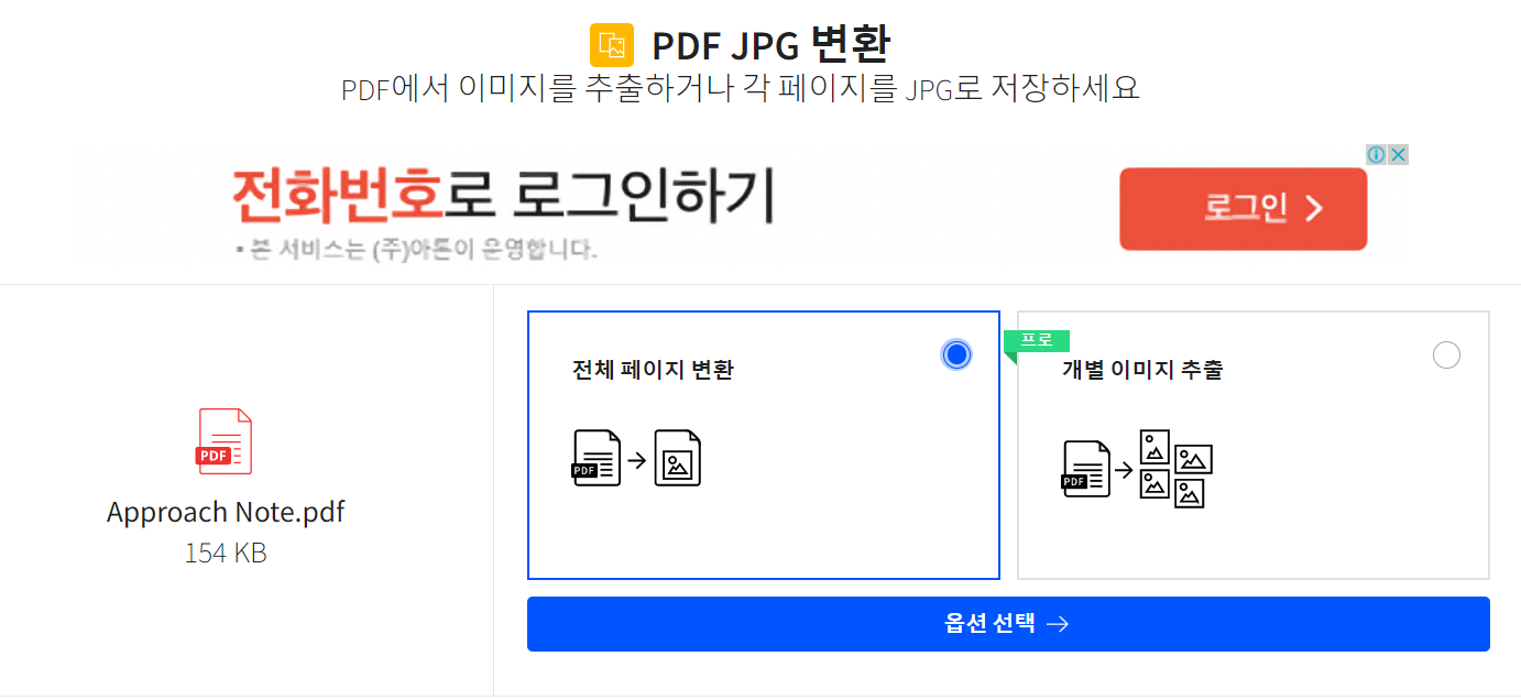 pdf 파일을 선택하면 위와 같이 변환하기 옵션이 나옵니다. 전체 페이지 변환을 선택합니다.