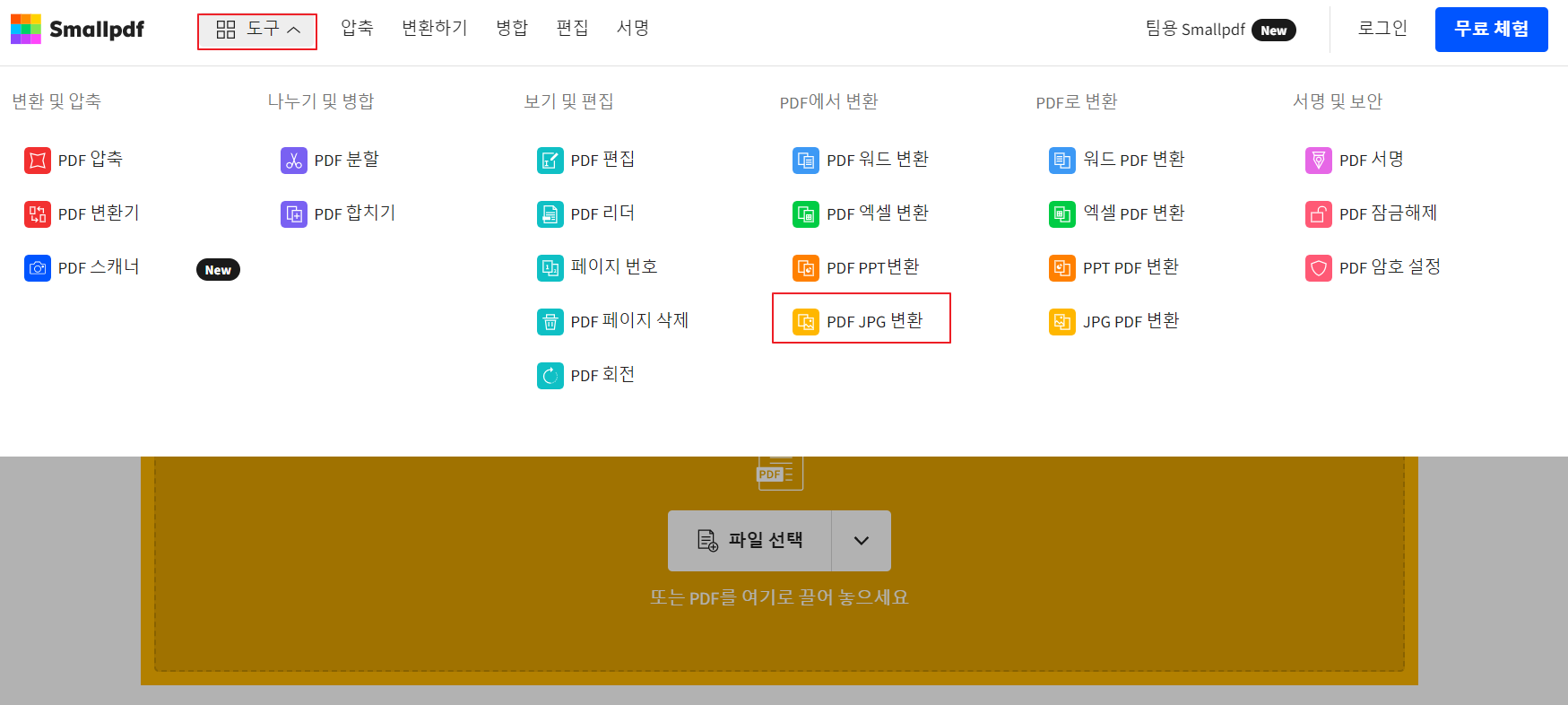 들어가시면 도구에서 위와 같이 파일변환이 다양하게 제시됩니다. pdf를 jpg로 변환하겠습니다.